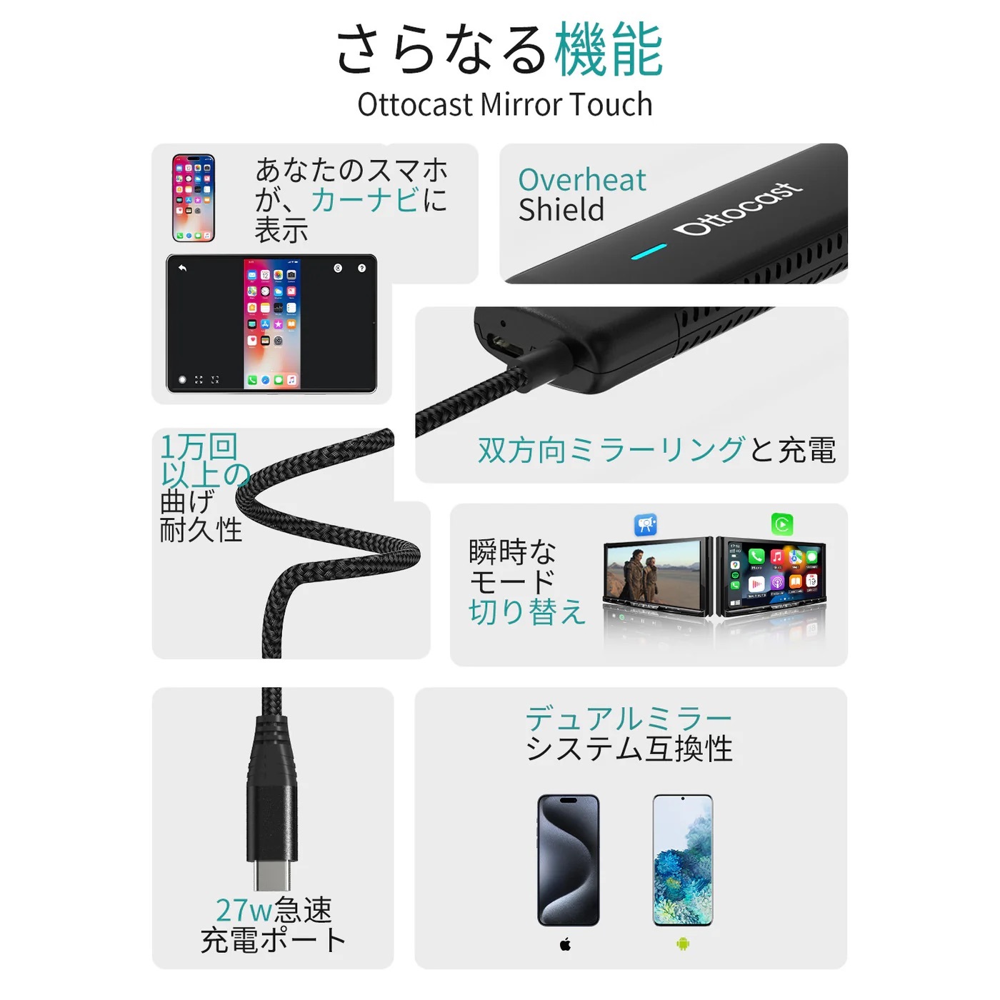 OTTOCAST Mirror Touch は、純正 CarPlay 対応車のディスプレイに、スマホの画面をそのまま映し出し — しかも タッチ操作 できるようにする、次世代のミラーリング/ワイヤレスアダプターです。